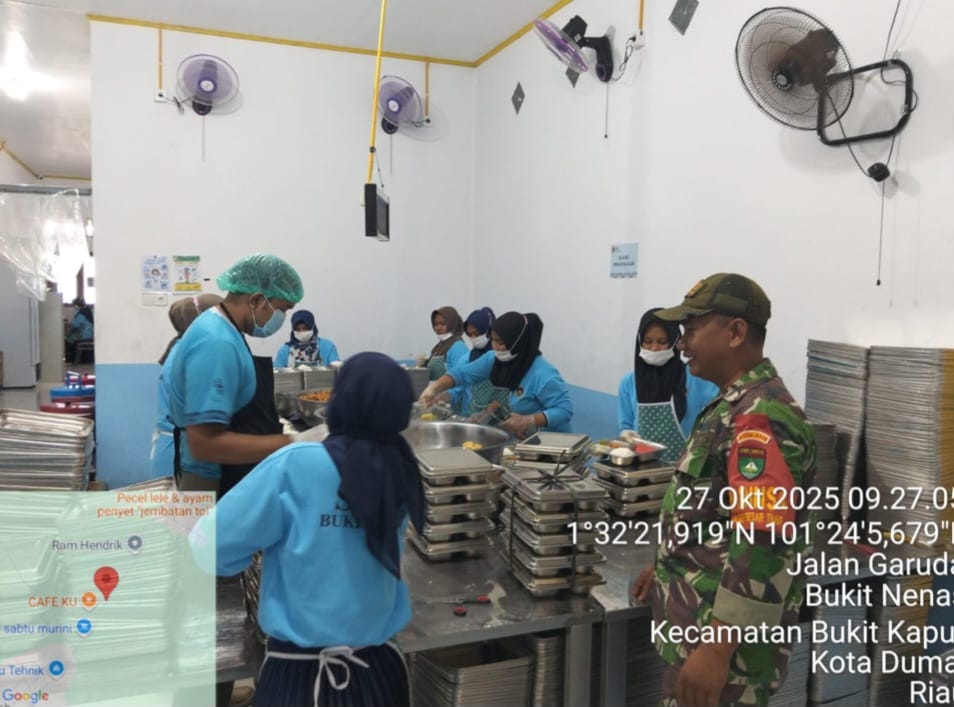 Dumai – Bintara Pembina Desa (Babinsa) Koramil 02/BK, Sertu Jumat Desmanto, menjadi ujung tombak dalam kegiatan pendampingan program makanan bergizi gratis yang dilaksanakan di Kecamatan Bukit Kapur, Senin (27/10/2025). Kegiatan yang merupakan hasil sinergi antara Yayasan Dumai Kota dan Badan Gizi Nasional (BGN) ini berhasil menjangkau ribuan siswa dari berbagai jenjang pendidikan.