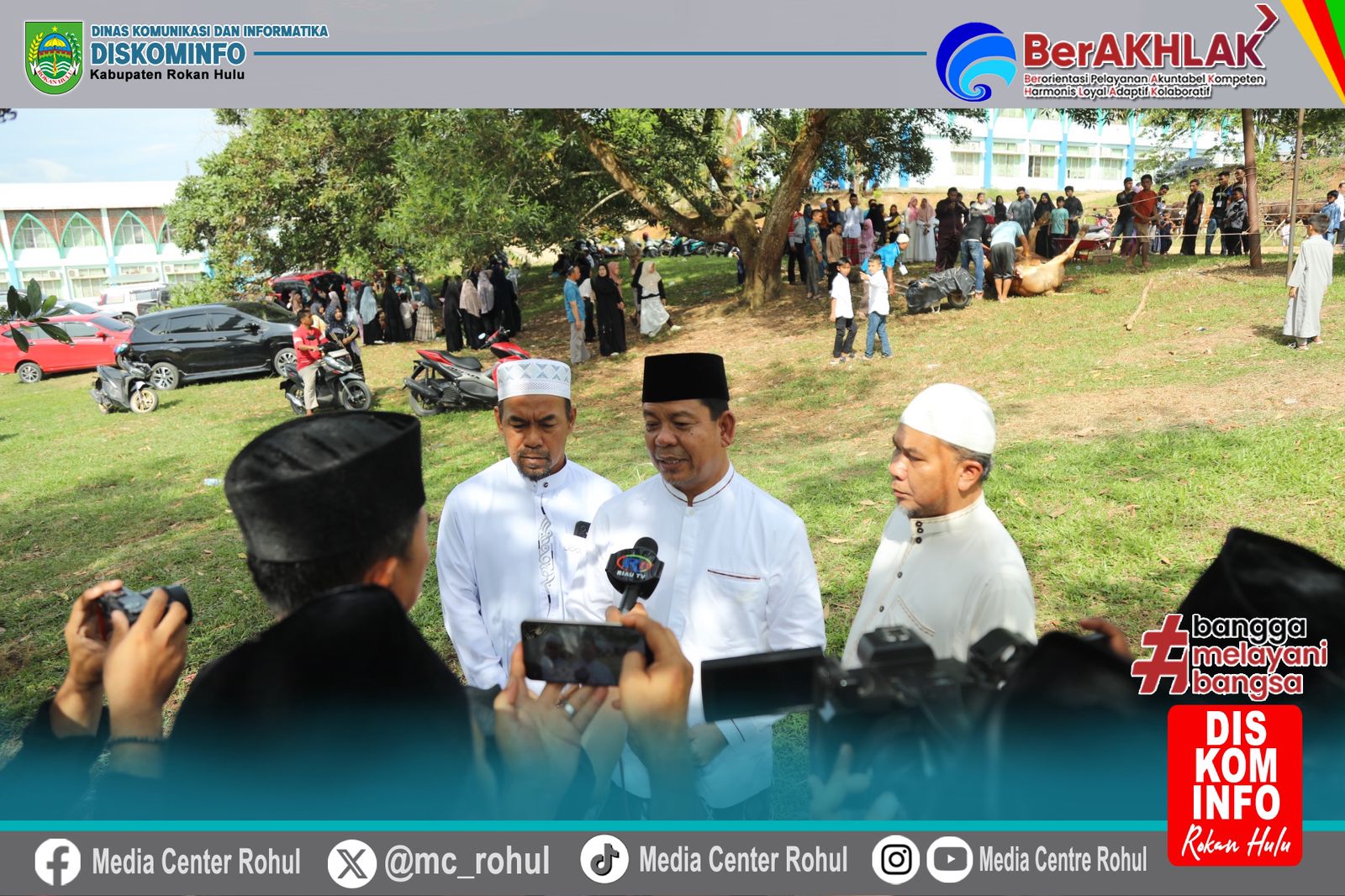 Rohul – Usai pelaksanaan shalat Idul Adha di Islamic Center Rokan Hulu, Bupati Rokan Hulu Anton, ST, MM dan Wakil Bupati Rokan Hulu H. Syafaruddin Poti, SH, MM melakukan serah terima kurban bantuan kemasyarakatan presiden RI untuk kabupaten Rokan Hulu berupa satu ekor sapi dengan bobot 820 Kg, di Halaman Belakang Mesjid Agung Islamic Center Rokan Hulu, Jumat (06/06/2025).