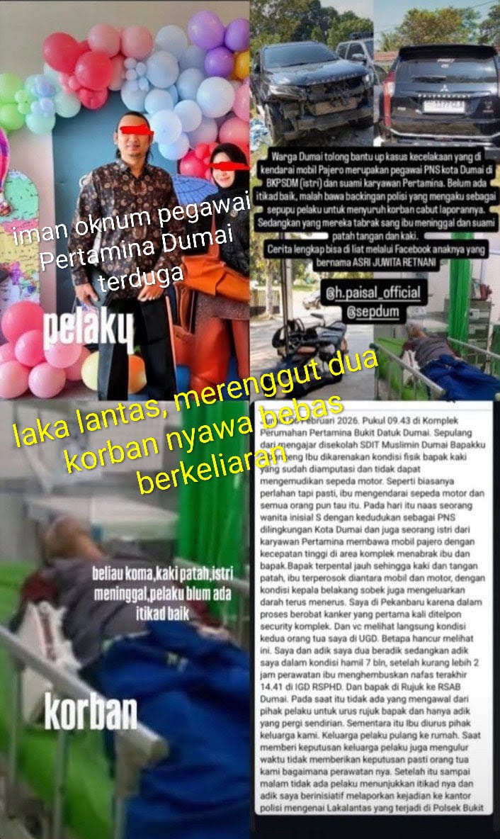 Adapun mobil Pajero sport Penabrak 2 korban tersebut diduga milik dan dikemudikan oleh Imam oknum pegawai Pertamina Dumai. Yang mana korban yang ditabrak diduga oleh Imam sempat dirawat di RS dan yang satunya meninggal Dunia.