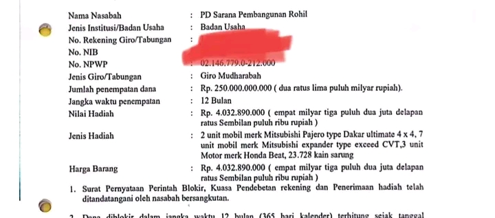 Didalam kutipan tersebut PD sarana pembangunan Rokan hilir (SPRH) sebagai nasabah, mendapatkan hadiah tabungan jika ditotal sebesar RP 300.000.000.000,00 (tiga ratus milyar ) dengan rincian :