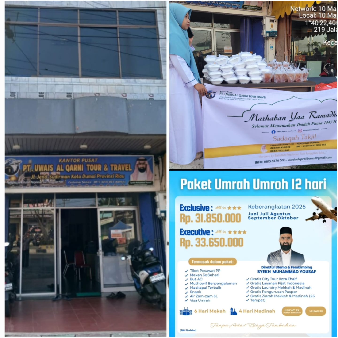 DUMAI – Dalam rangka menyemarakkan Ramadan 1447 H, Kantor Pusat PT Uwais Al Qarni Tour dan Travel Haji dan Umrah membagikan hampir 200 paket takjil kepada masyarakat dan pengendara yang melintas di depan kantor di Jalan Jenderal Sudirman, Kelurahan Bintan, Kecamatan Dumai Kota, Selasa (10/3/2026).