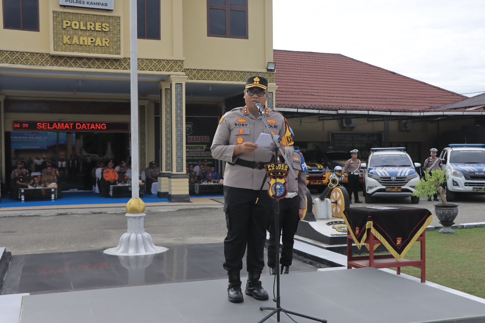 Bertindak selaku Pimpinan Apel Kapolres Kampar AKBP Boby Putra Ramadhan S, Perwira Apel Kasat Lantas Akp Wulan Afdhalia Ramdhani, dan Komandan Apel Ipda Eka Putera