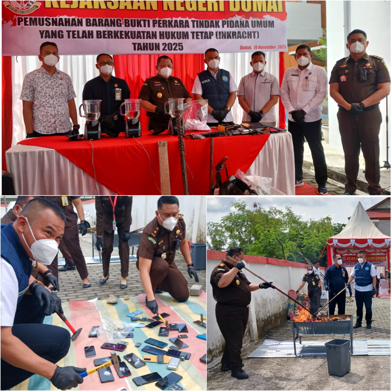 DUMAI — Kejaksaan Negeri Dumai kembali melaksanakan pemusnahan barang bukti dari berbagai perkara tindak pidana yang telah berkekuatan hukum tetap. Kegiatan berlangsung secara terbuka di halaman Kantor Kejari Dumai, Jalan Sultan Syarif Kasim, Kelurahan Teluk Binjai, Kecamatan Dumai Timur, dengan pengawalan ketat serta disaksikan unsur Forkopimda dan perwakilan instansi terkait. 19 November 2025.