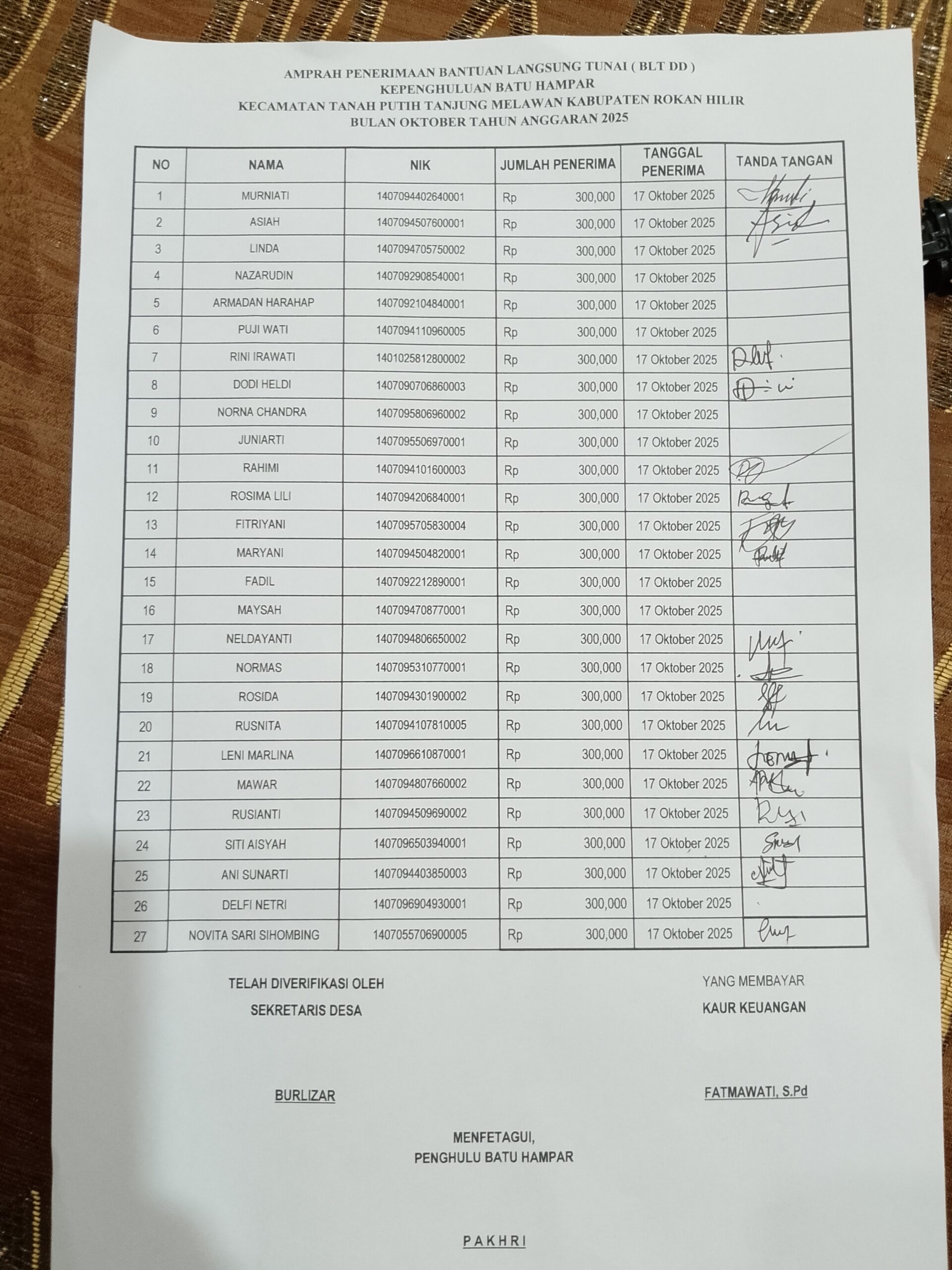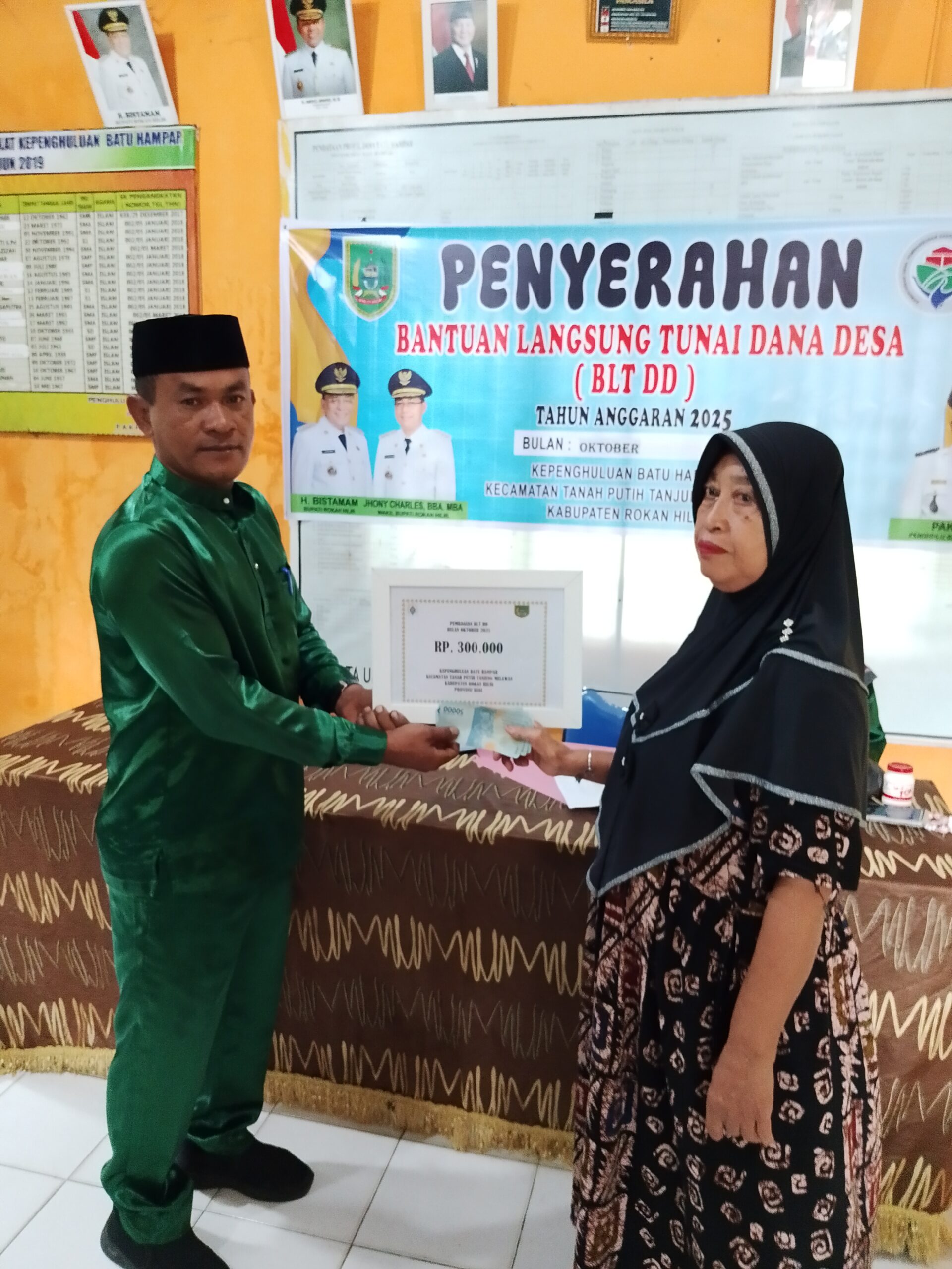 Cakrarepublik.com — batu hampar, TPTM —Pemerintah Kepenghuluan batu hampar, kecamatan tanah putih tanjung melawan (TPTM),  kembali menyalurkan Bantuan Langsung Tunai (BLT) Dana Desa untuk periode bulan Oktober 2025. Penyaluran yang berlangsung di kantor kepenghuluan batu hampar ,jalan tenaga ini disambut antusias oleh 27 warga miskin penerima manfaat , pada Jumat (17/10/2025)