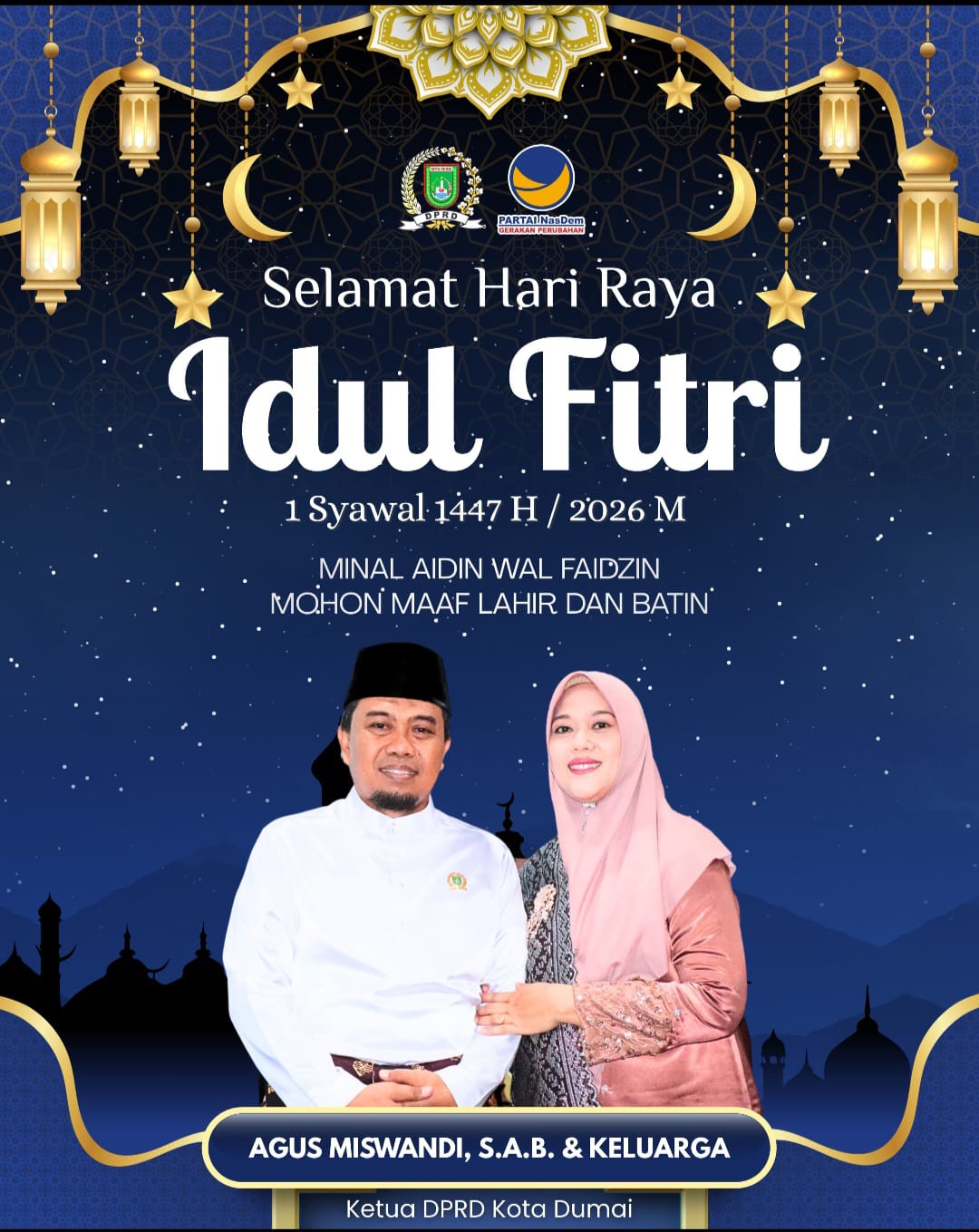 DUMAI – Ketua DPRD Kota Dumai, Agus Miswandi, S.A.B., menyampaikan ucapan Selamat Hari Raya Idul Fitri 1447 H / 2026 M kepada seluruh masyarakat.