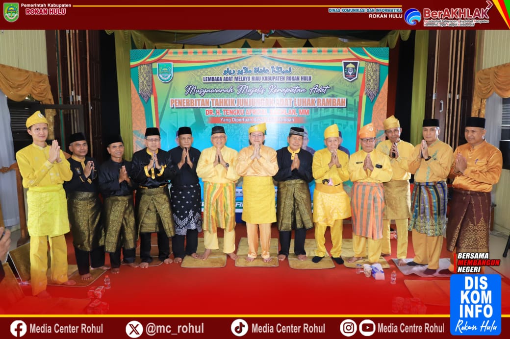 Rohul – Lembaga Adat Melayu Riau (LAMR) Rokan Hulu (Rohul) dalam Musyawarah Majelis Kerapatan Adat laksanakan kegiatan penerbitan Tahkik Junjungan Adat Luhak Rambah Raja Luhak Rambah Gelar Yang Dipertuan Besar dr. H. Tengku Afrizal Dachlan, M.M, Gedung Balai Adat LAMR Rohul, Sabtu (04/10/2025).