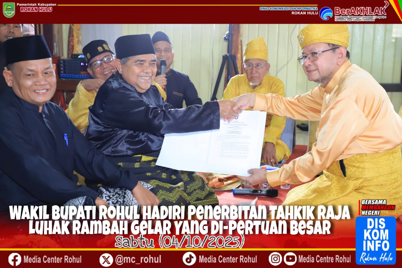 Melalui mufakat bersama setiap pihak terkait, Penabalan Raja Luhak Rambah Gelar Yang Dipertuan Besar dr. H. Tengku Afrizal Dachlan, M.M akan dilaksanakan pada Kamis (09/10/2025), hal ini menjadi momen penting mengingat telah terjadinya kekosongan penerus sejak tahun 2003. (HRD/Diskominfo).