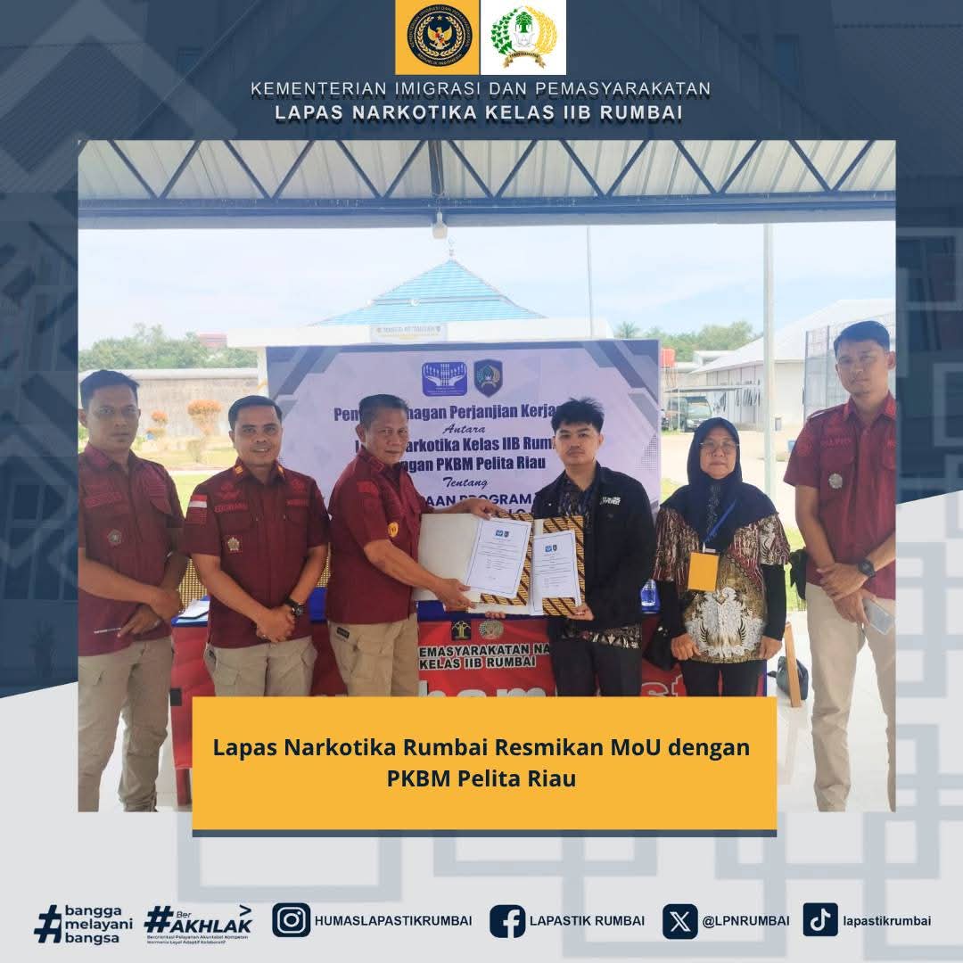 Penandatanganan MoU dilakukan oleh Kepala Lapas Narkotika Rumbai, Reinhards Indra Pitoy dan Jajaran Binadik serta Ketua PKBM Pelita Riau. Kegiatan ini merupakan dukungan penuh terhadap upaya peningkatan kualitas layanan pembinaan di dalam Lapas.