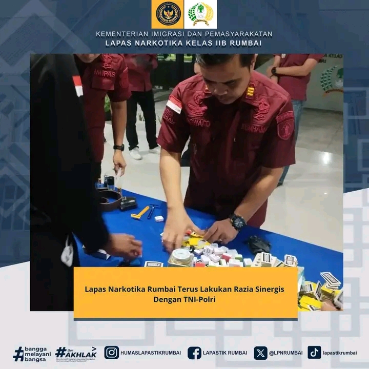 Pekanbaru – Lembaga Pemasyarakatan (Lapas) Narkotika Kelas IIB Rumbai bersinergi dengan TNI dan Polri menggelar razia gabungan kamar hunian warga binaan pada hari Sabtu dini hari tepat pukul 00.00 WIB. Kegiatan ini merupakan wujud komitmen melaksanakan Arahan 13 (tiga belas) Program Akselerasi Menteri Imigrasi dan Pemasyarakatan khususnya pada poin 1 (satu) yakni Memberantas Peredaran Narkoba dan Pelaku Penipuan dengan berbagai modus di Lapas dan Rutan, Sabtu (11/10/2025).