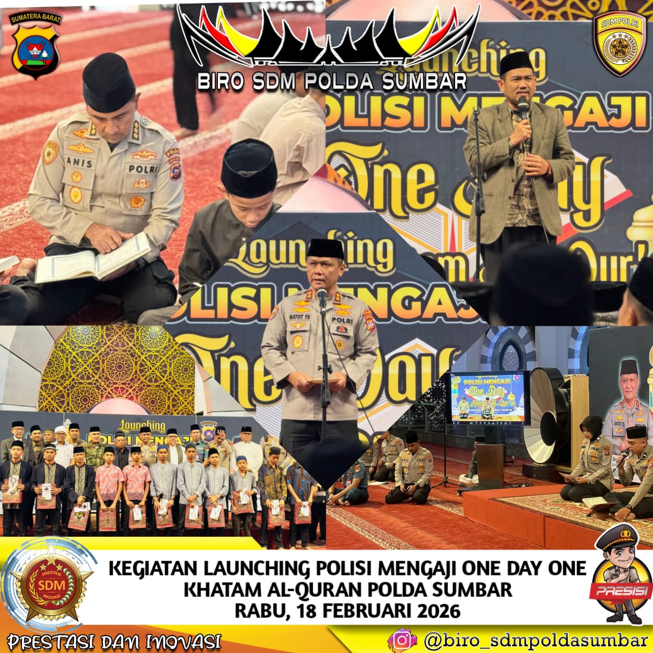 Padang – Dalam rangka menyambut bulan suci Ramadan 1447 H/2026 M, Polda Sumbar menggelar kegiatan Launching One Day One Khatam Al-Qur’an yang dilaksanakan pada Rabu (18/2/2025) pukul 05.00 WIB hingga selesai, bertempat di Masjid Syeikh Ahmad Khatib Al-Minangkabawi.