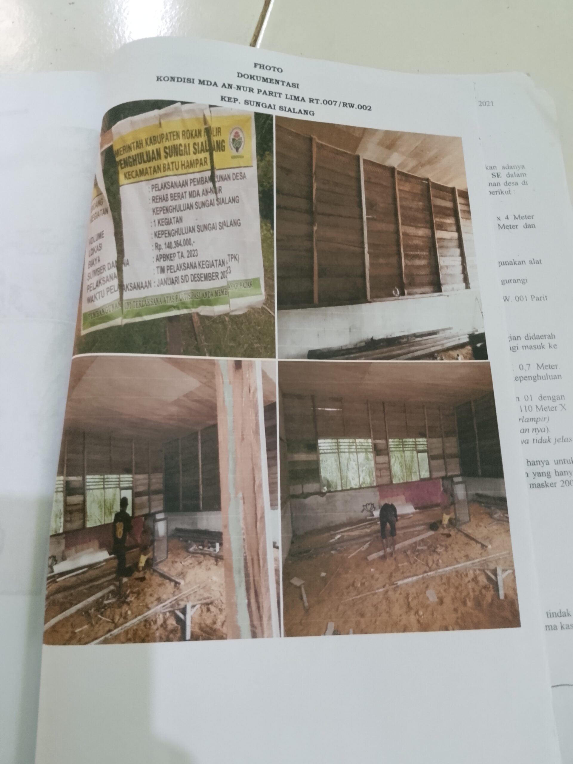3.Rehap Berat Rumah MDA AN-NUR di Parit Lima RT.007/RW.002 Tahun Anggaran 2023 sebesar 140.364.000 yang tidak sesuai anggaran dan dikelola langsung oleh Oknum Mantan Penghulu Sungai Sialang (A) selaku Pengguna Anggaran tanpa melibatkan Tim Pelaksana Kegiatan (TPK) dan disaat melaksanakan pekerjaan Penghulu tidak memberikan Bastek sama sekali baik kepada TPK, pekerja maupun kepada pengawas (BPKep), sehngga terjadinya penyimpangan yaitu Papan yang digunakan adalah Papan Sembarangan (Kayu Merah) sementara di Rencana Anggaran Biaya (RAB) Menggunakan kayu Kelas II, Jendela masih memakai Jendela Lama sementara di RAB memakai Jendela Baru, papan dinding depan sama sekali tidak diganti tapi hanya dikikis dan dicat begitu saja.