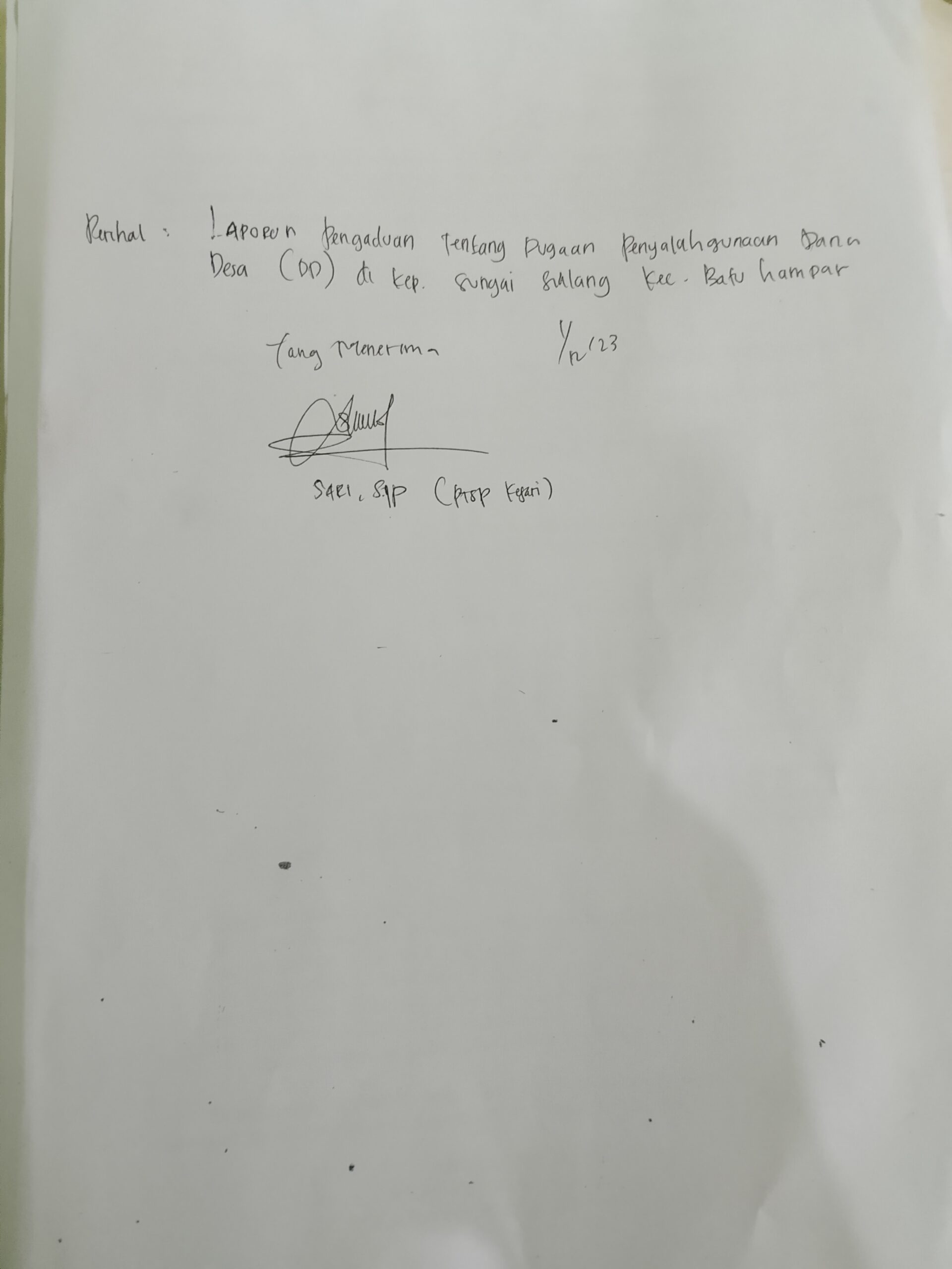6. Adanya Penggelapan Dana (Fiktif Angaran) atas Penyaluran Bantuan Langsung Tunai (BLT) Dana Desa Tahun Angaran 2023 yang dilakukan oleh oknum Bendahara Kepenghuluan Sungai Sialang (AS) selaku juru bayar sebayak 2 orang warga penerima BLT hingga saat ini belum disalurkan sama sekali yaitu 1 warga (6 Bulan x 300.000 1800.000 dan 1 warganya ((3 Bulan x 300.000) 900.000 dengan total yang belum disalurkan oleh Bendahara Kepenghuluan sebesar Rp. 2.700.000
