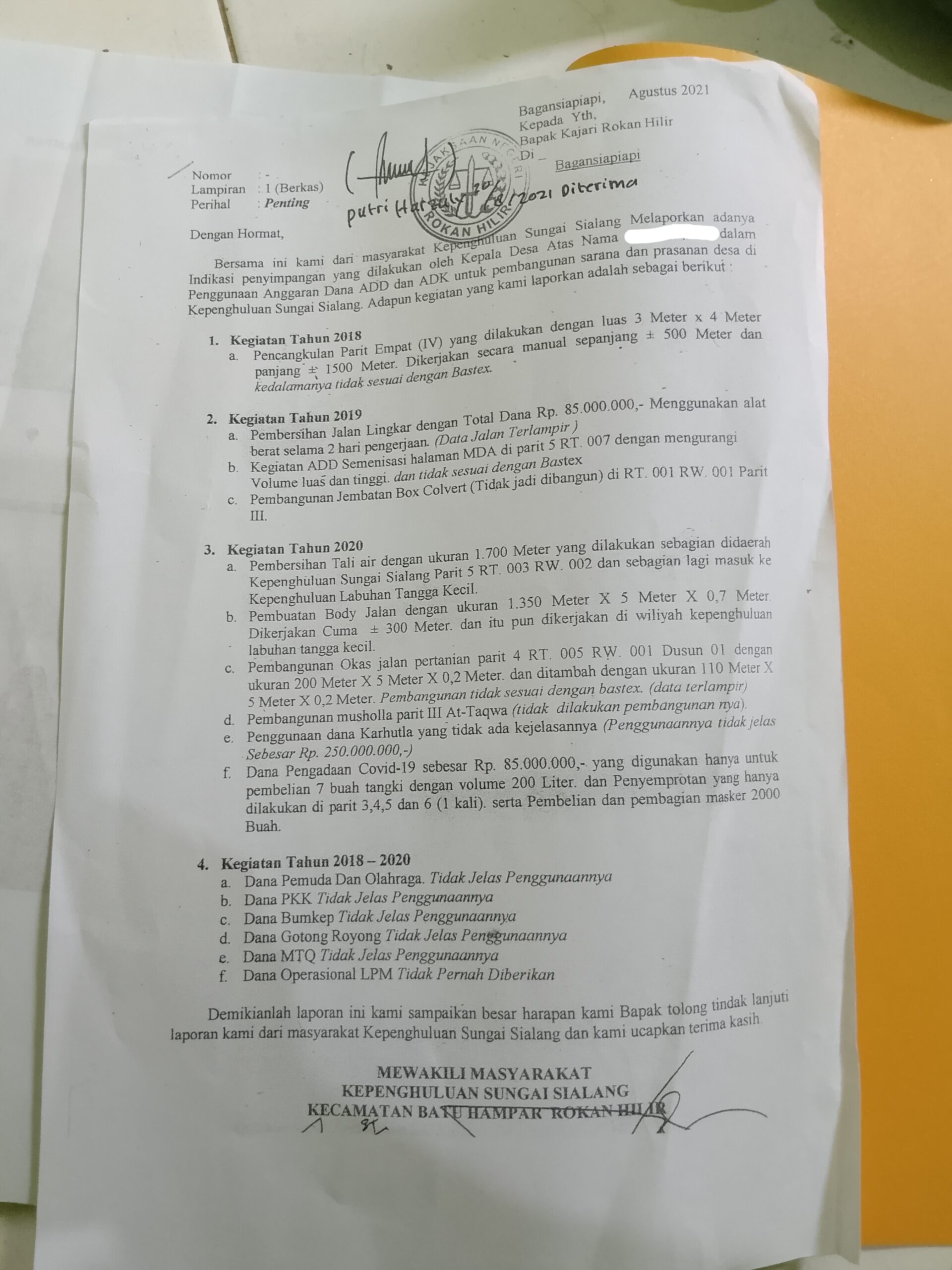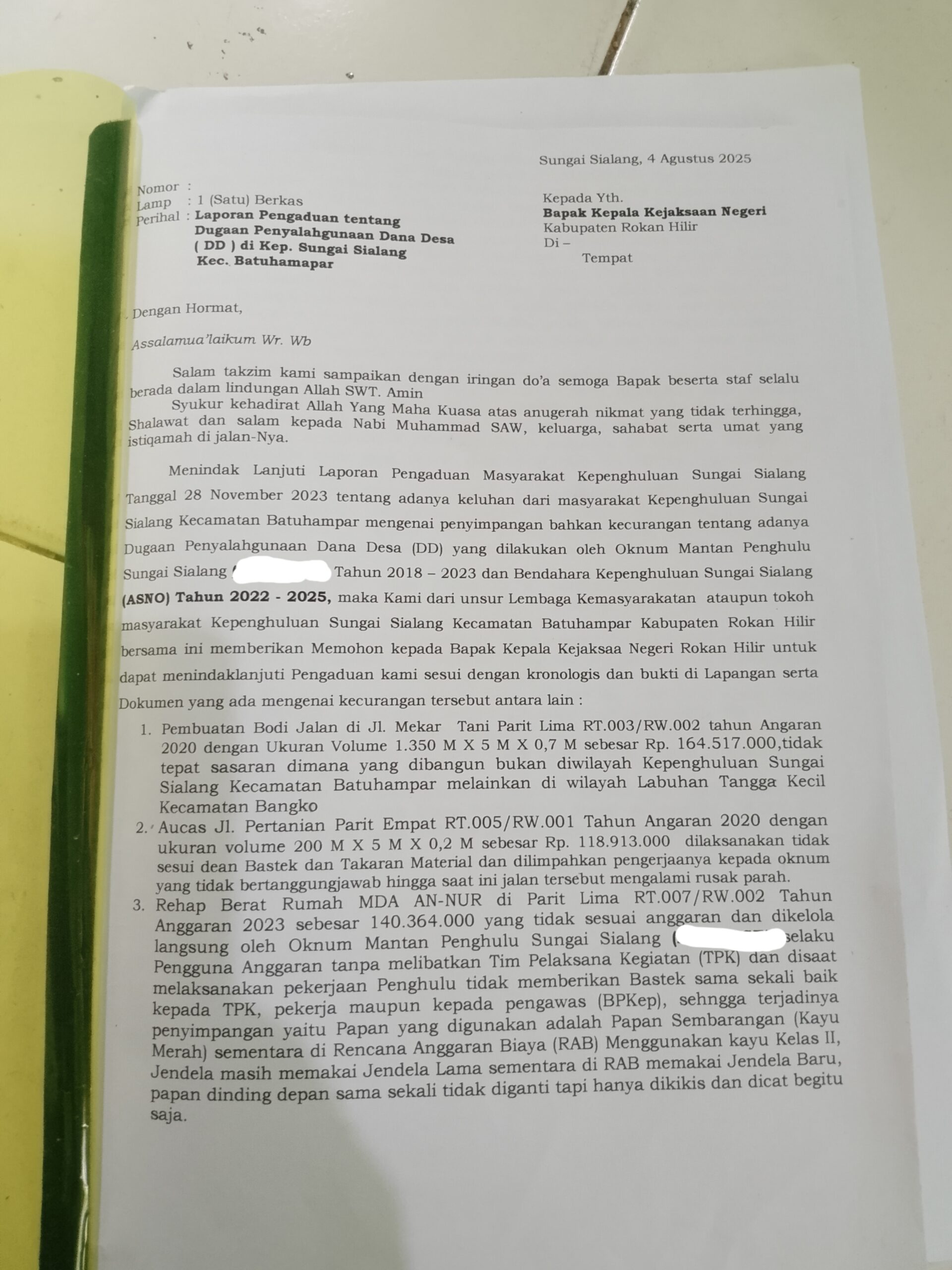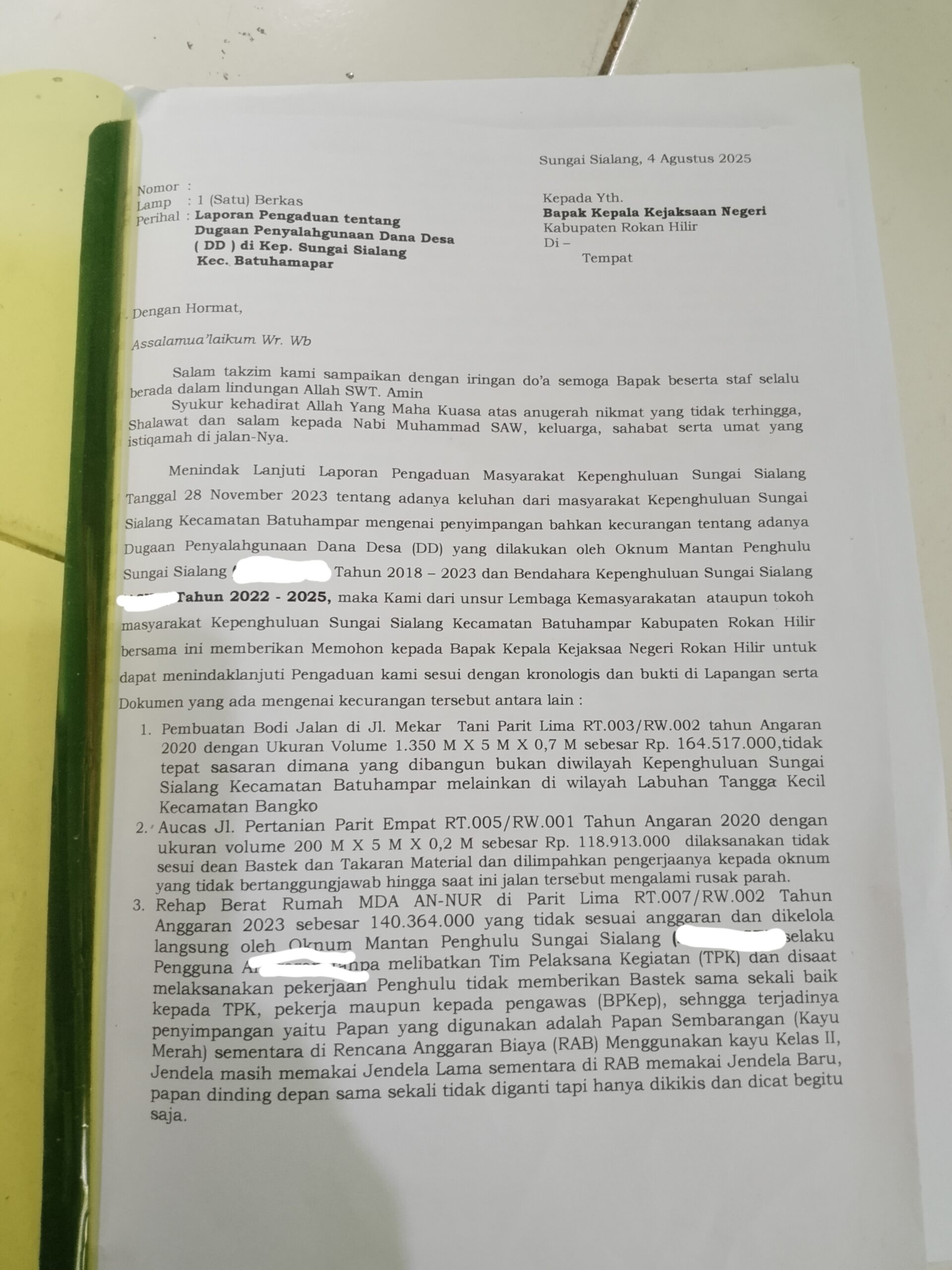 Mantan penghulu sungai sialang dilaporkan ke kejari rohil oleh warganya, diduga penyalah gunaan anggaran desa
