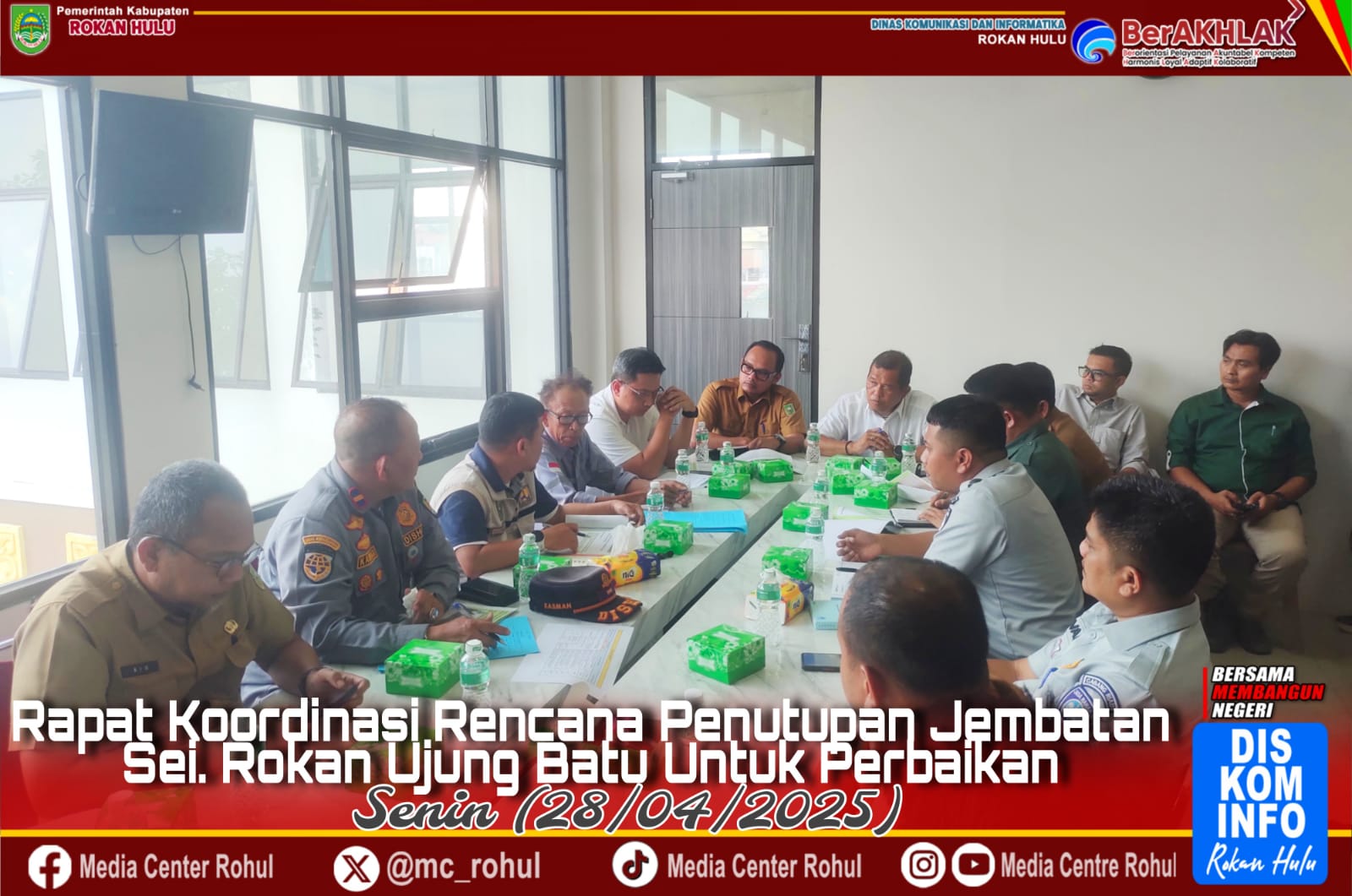 Rohul– Pemerintah Provinsi Riau melalui Kepala Dinas Perhubungan Provinsi Riau Andi Yanto, S.H. M.H lakukan Rapat Koordinasi (Rakor) rencana penutupan jembatan sungai Rokan dalam rangka perbaikan dan pemeliharaan jembatan. Ujung Batu, Senin (28/04/2025).