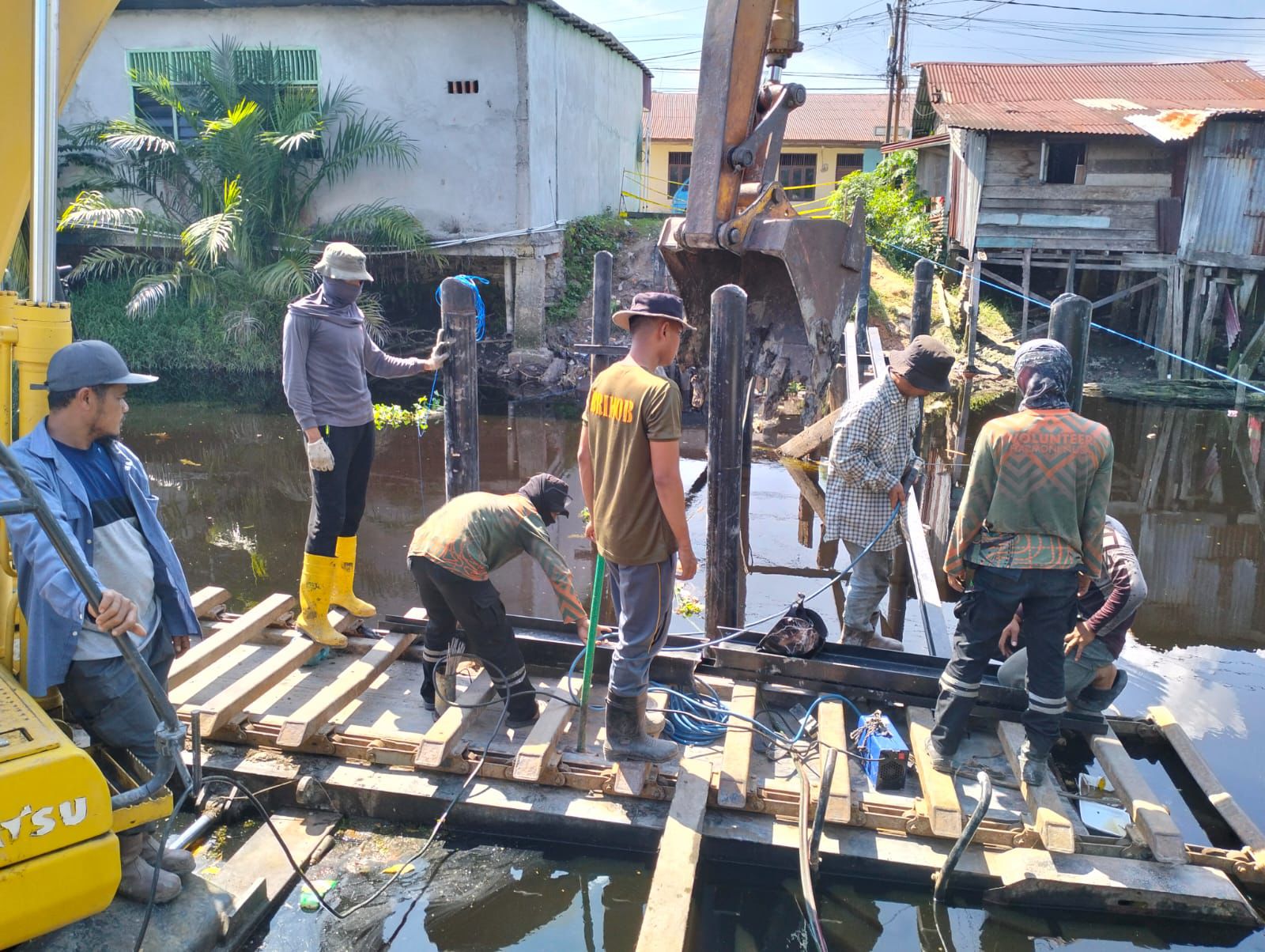 Di lokasi pertama yang berada di Jalan Perintis, Kelurahan Bumi Ayu, Kecamatan Dumai Selatan, pekerjaan difokuskan pada pemindahan scor dan kayu serta pemasangan struktur penyangga jembatan. Kegiatan ini melibatkan gabungan personel kepolisian dan relawan yang bekerja secara gotong royong.