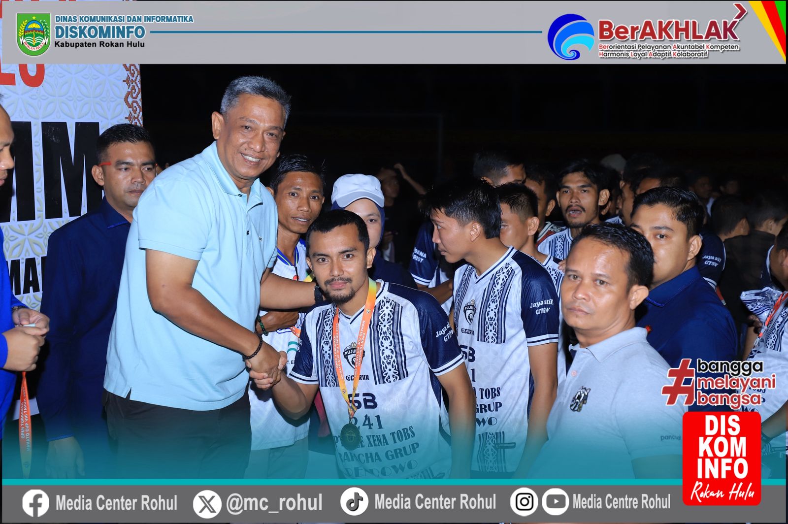 Bupati Rokan Hulu, Anton, ST, MM yang hadir bersama Kapolres Rohul AKBP Eka Emil Putra, SIK, MH, M.Si, Kajari Rohul Dr. Rabani Meryanto Halawa, SH, MH, serta Kepala Desa Mahato Feriadi, memberikan apresiasi atas suksesnya turnamen ini.