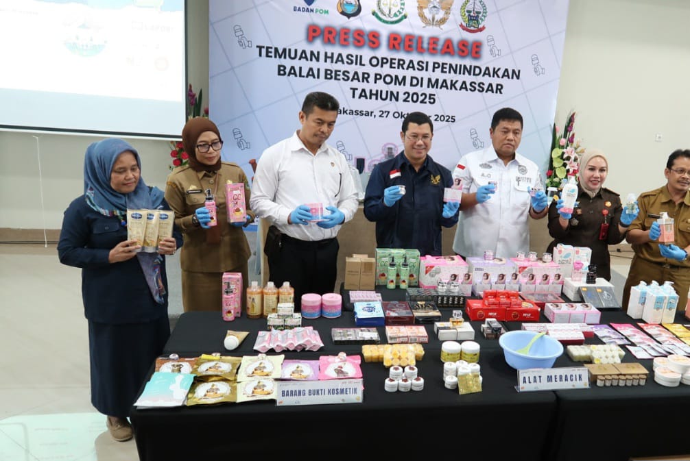 Makassar, 04-11-2025 – Balai Besar Pengawas Obat dan Makanan (BBPOM) Makassar bersama instansi terkait menegah ribuan produk kosmetik tanpa izin edar di wilayah Sulawesi Selatan. Kegiatan ini disampaikan dalam konferensi pers hasil penegahan yang digelar di Aula Kantor BBPOM Makassar pada Selasa, 28 Oktober 2025.