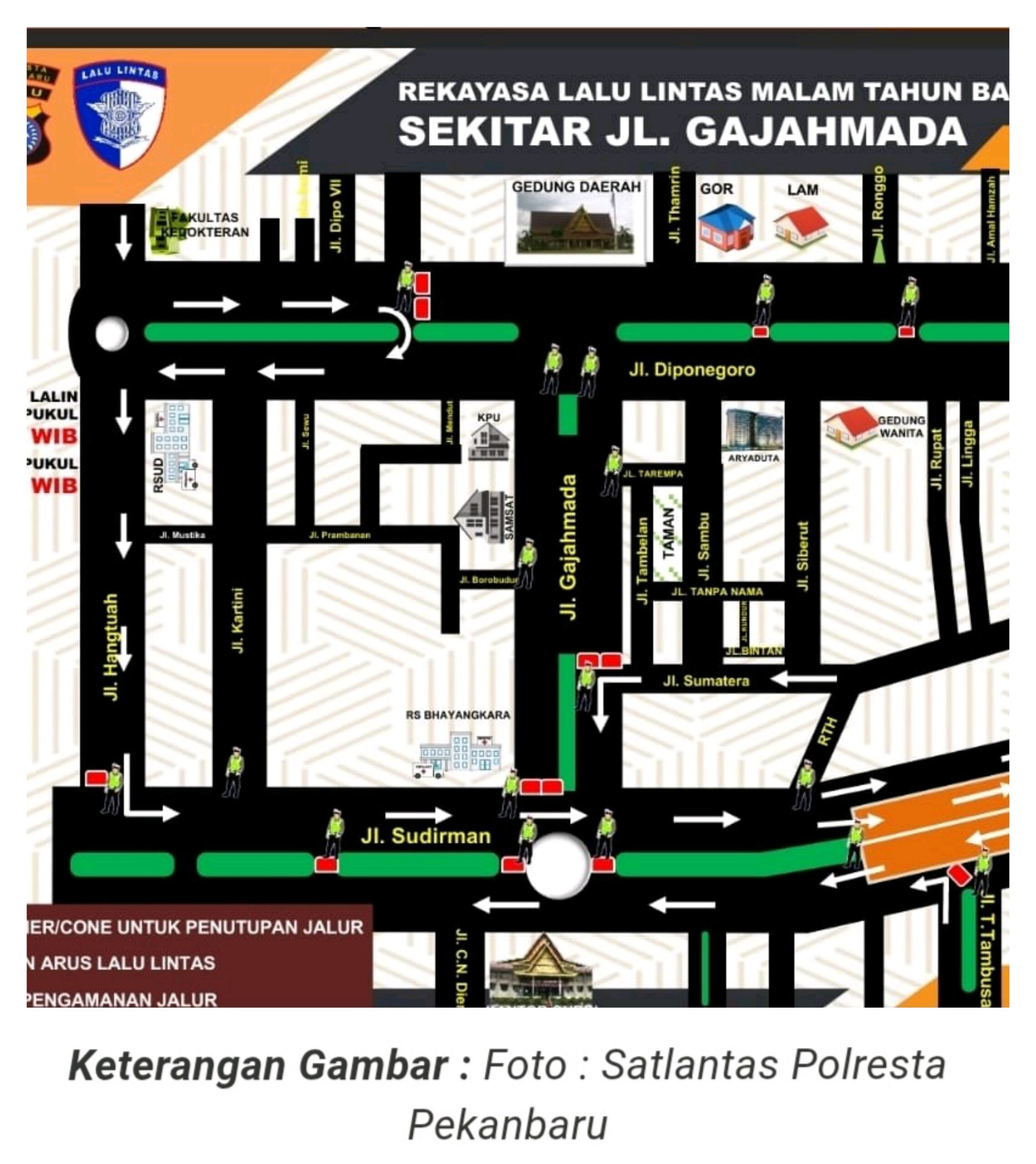 Kasat Lantas Polresta Pekanbaru AKP Satrio B.W. Wicaksana mengatakan, sejumlah ruas jalan utama di pusat kota akan ditutup sementara, di antaranya Jalan Jenderal Sudirman kawasan Purna MTQ, Jalan Gajah Mada, dan Jalan Diponegoro. Penutupan mulai diberlakukan pada Rabu (31/12/2025) pukul 22.00 WIB hingga sekitar pukul 01.00 WIB.