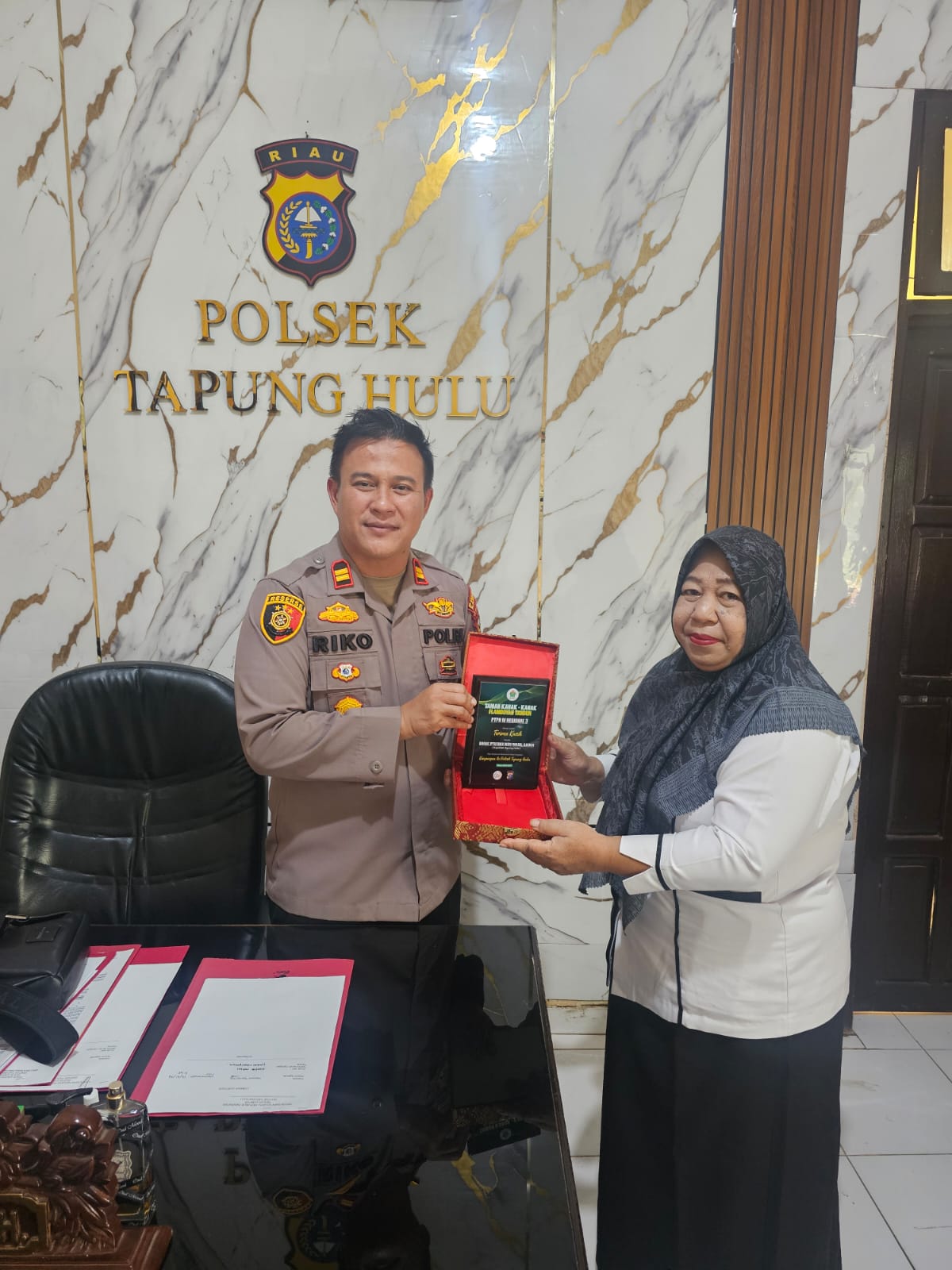 Tapung Hulu – Dalam upaya memperkuat kedekatan Polri dengan dunia pendidikan sejak usia dini, Kapolsek Tapung Hulu, Iptu Riko Rizki Masri, S.H., M.H., secara resmi menerima plakat penghargaan dari Manajemen Taman Kanak-Kanak (TK) Flamboyan Tandun PTPN IV Regional 3, Rabu (14/1/2026).