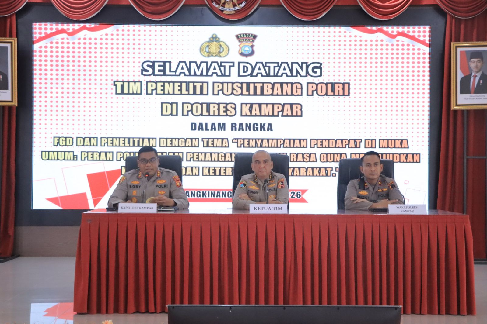 KAMPAR – Bertempat di Aula Sanika Satyawada Polres Kampar, hari Selasa, (3/3/2026), pukul 13.00 WIB, seluruh rangkaian kegiatan penelitian dari Pusat Penelitian dan Pengembangan (Puslitbang) Polri tentang “Penyampaian Pendapat di Muka Umum, Peran Polri dalam Penanganan Unjuk Rasa/Demonstrasi Guna Mewujudkan Keamanan dan Ketertiban Masyarakat Tahun 2026” berhasil dilaksanakan dengan baik dan penuh kekhidmatan.
