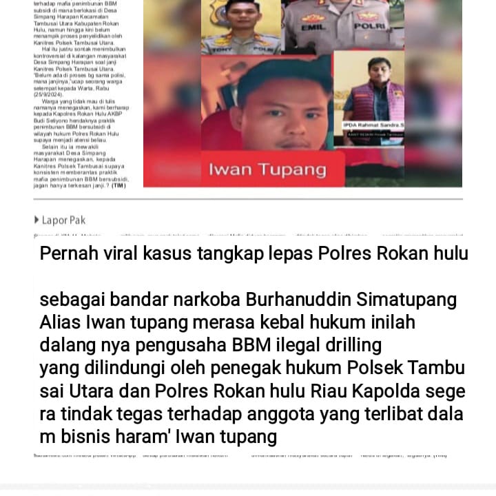Sepertinya hukum sudah takluk oleh mafia sehingga tidak ada lagi penindakan terhadap Burhanuddin Simatupang Alias Iwan tupang pemasok BBM subsidi tsb dan pernah viral pelaku pengedar narkoba tangkap lepas Polres Rokan hulu Riau hukum telah di perjualbelikan di Rokan hulu Riau.